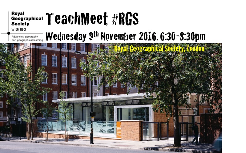 Royal Geographical Society 1 Kensington Gore, London, United KingdomVery excited to announce a TeachMeet at the Royal Geographical Society! Wednesday 9th November 2016 6:30-8:30pm 1 Kensington Gore, London SW7 2AR #tmrgs Please note that you do not need to be a member of the GA or RGS to attend this event.